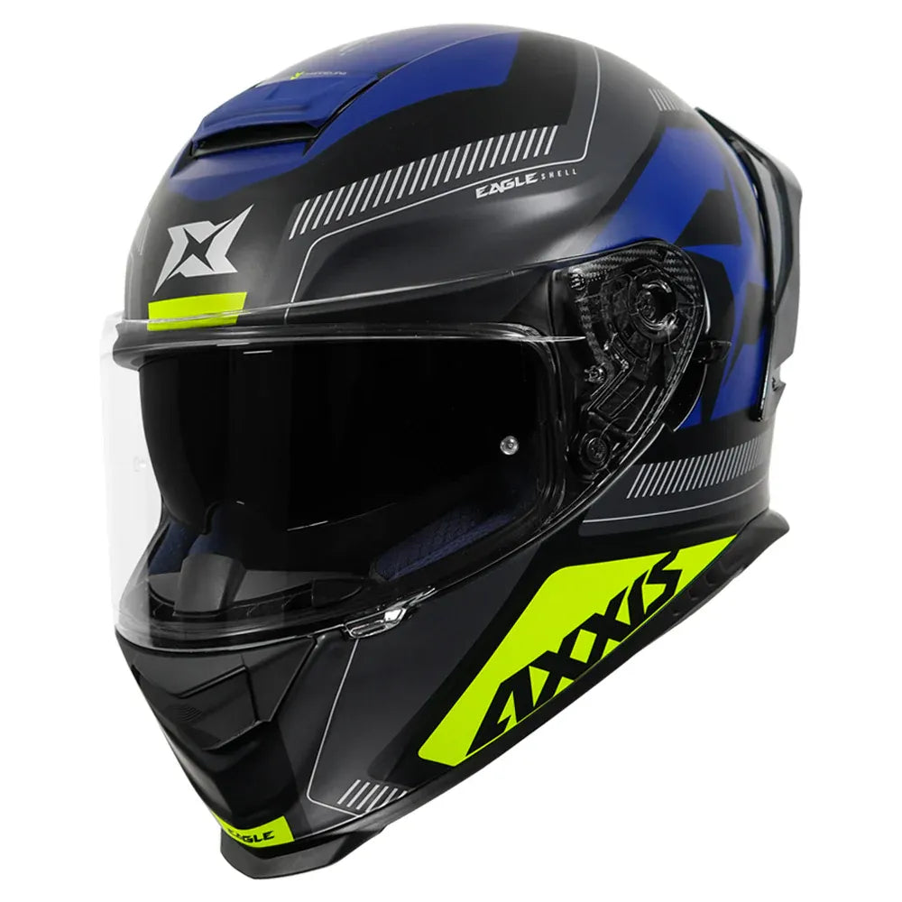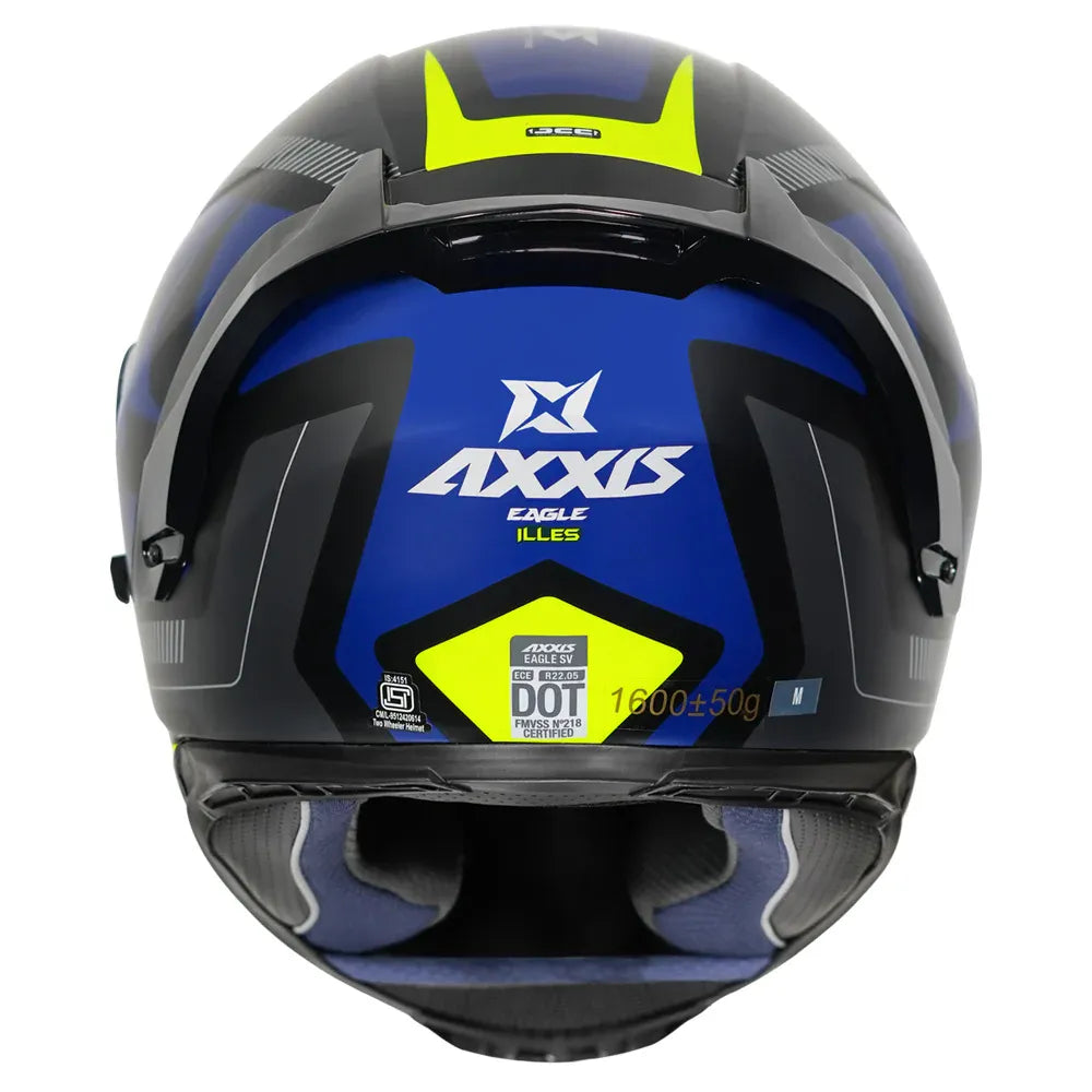 Introducing the Axxis Eagle full-face helmet with excellent levels of safety. The helmet has triple certifications, ECE 22.05, DOT and ISI. The helmet has a polycarbonate shell, internal ventilation, dual visor and an aerodynamically designed spoiler that makes it perfect for every rider