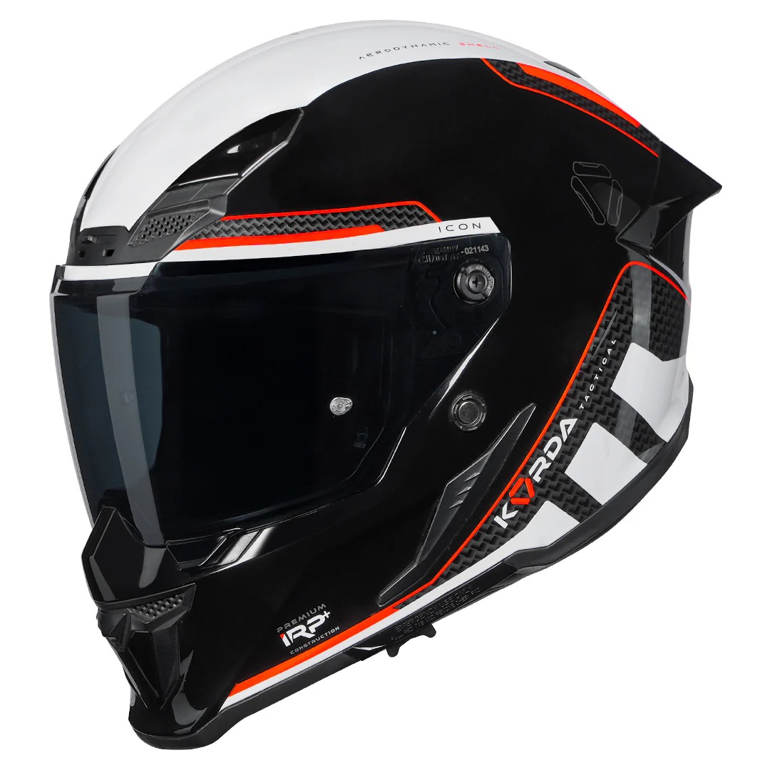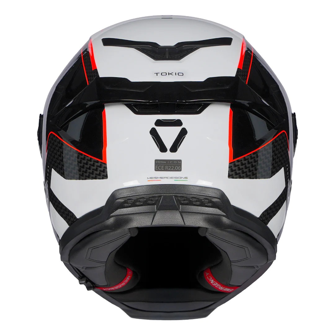 Ride with confidence using the Korda Icon Tokio White Red Full Face Helmet, combining certified safety, comfort, and bold performance styling.