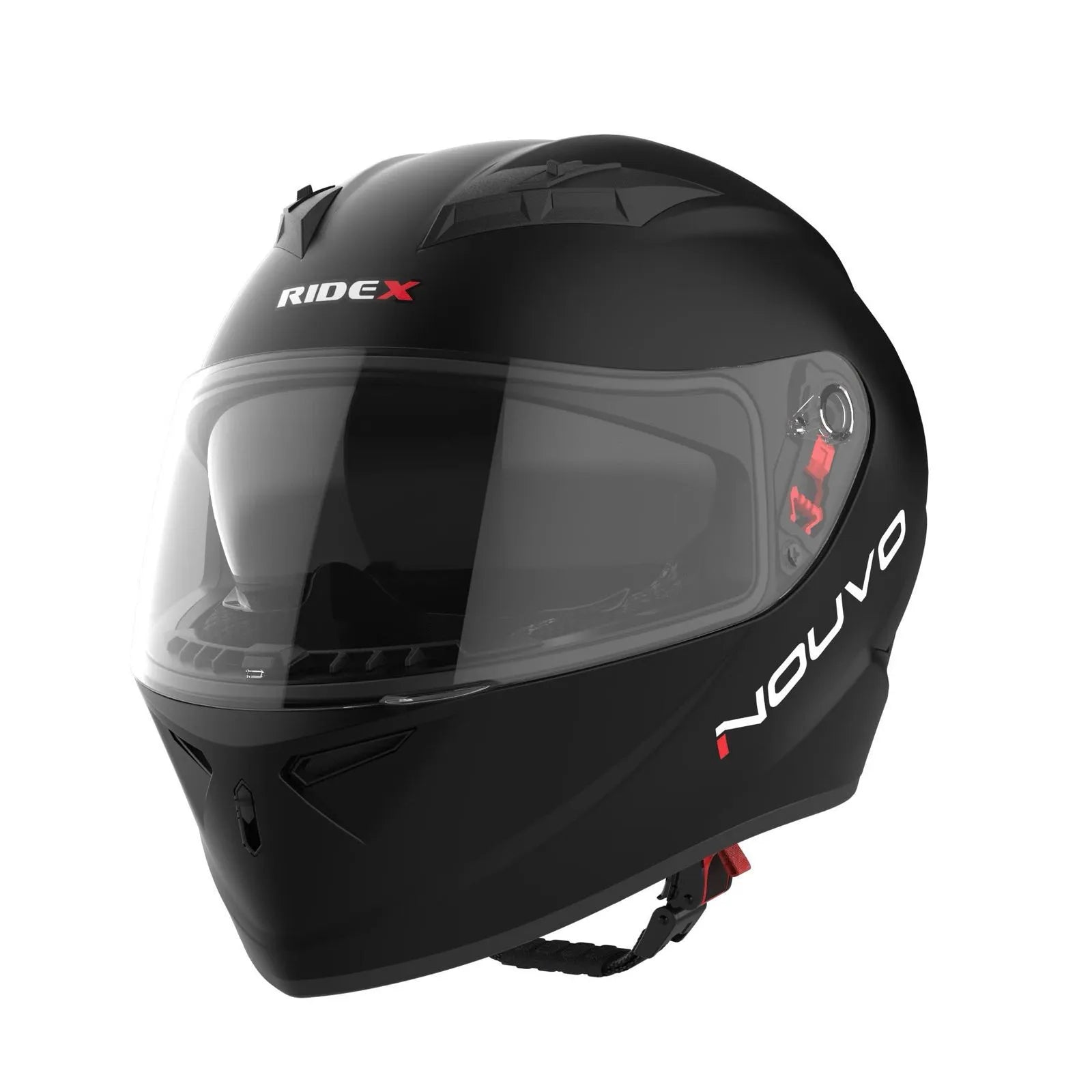 The Ridex Nouvo Midnight Glossy Black Full Face Helmet offers ultimate protection and style for riders seeking safety and comfort. Featuring a dual visor for versatile protection, its aerodynamic ABS shell (PA-709S) provides ultra-high impact strength while reducing buffeting. The multi-density EPS lining is designed to effectively dissipate crash energy. For added comfort, the helmet comes with an anti-bacterial, breathable inner lining that is removable, washable, and quick-dry. The ergonomic earpiece design ensures a snug fit, while the anti-scratch, polycarbonate visor with three adjustable positions provides a wider field of vision. With a rapid shield replacement system, changing visors is quick and tool-free. The anti-fog system supports lens-ready visors with easy-to-fix lens locks. Ventilation is maximized with an upgraded integrated ventilation system, featuring mouth, top, and rear vents to maintain airflow and keep you comfortable. For security, the double D ring buckle ensures a secure fit, offering one of the safest locking mechanisms. Available in sizes S, M, L, and XL, the helmet comes in a stunning Midnight Glossy Black color, making it a stylish and reliable choice for every rider.