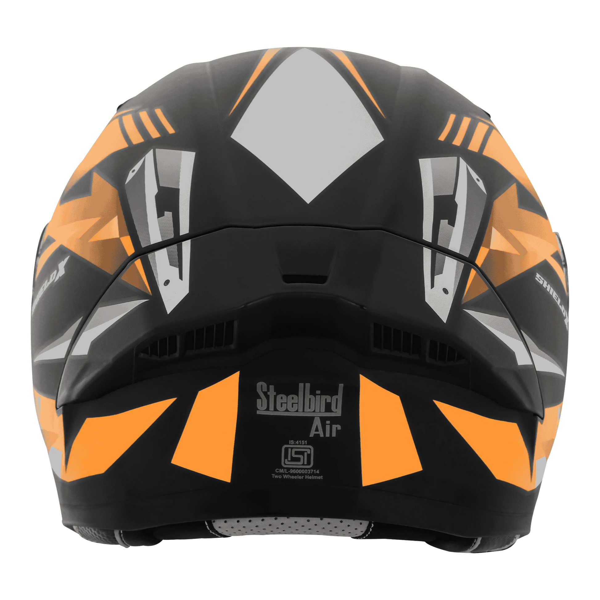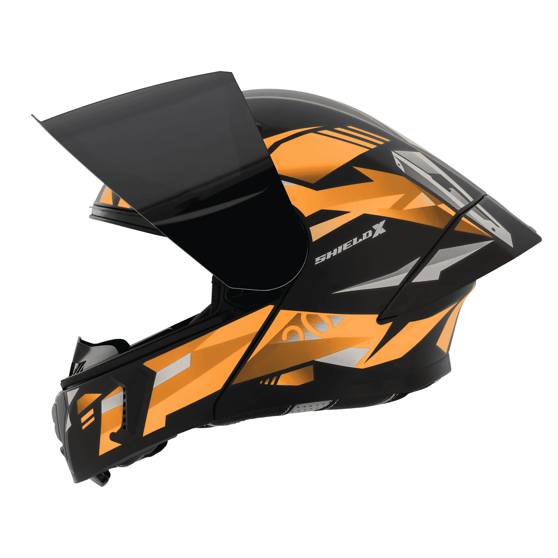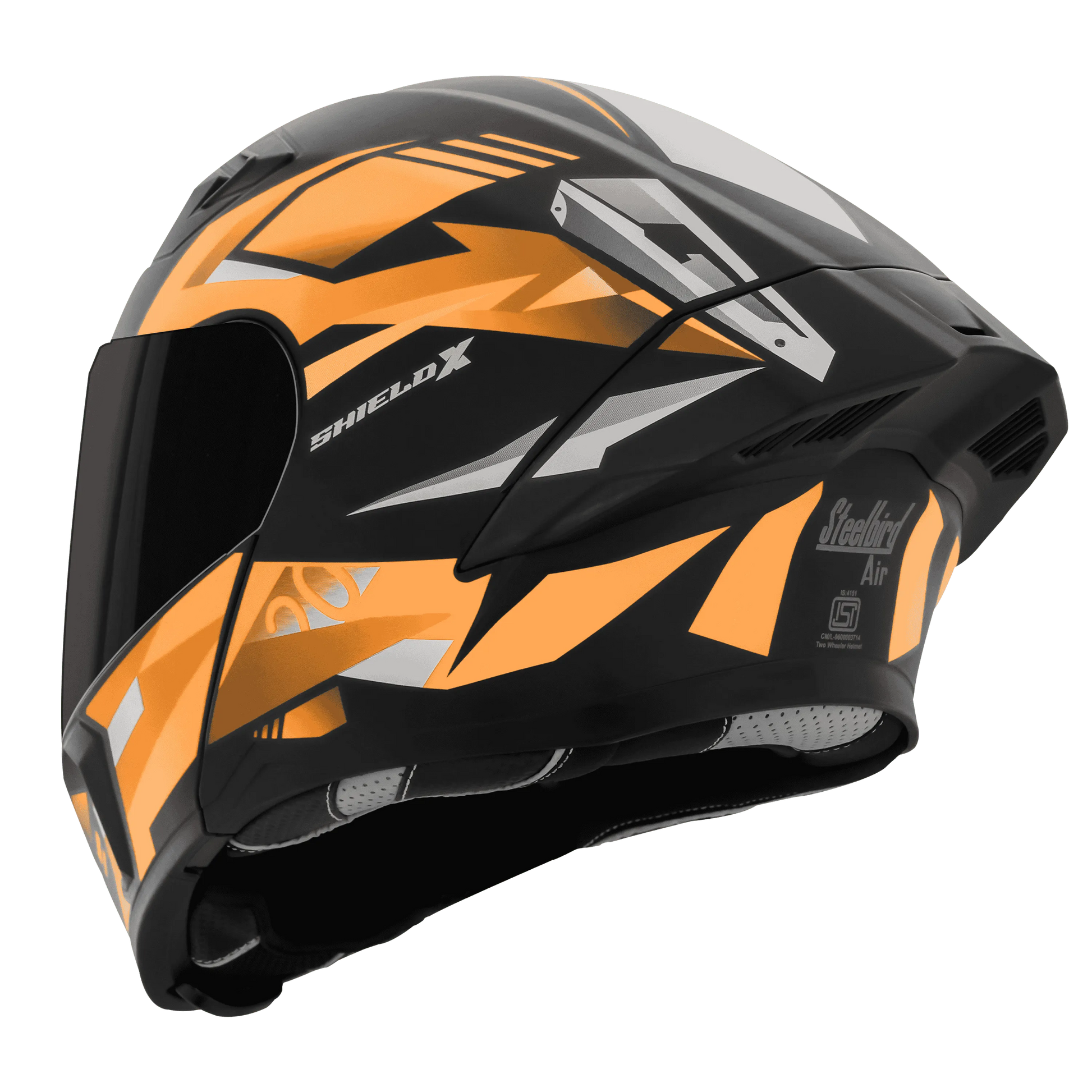 Enhance your riding experience with the Steelbird SBA-20 Shield X Glossy Black Orange Flip Up Helmet. Order now to secure yours!