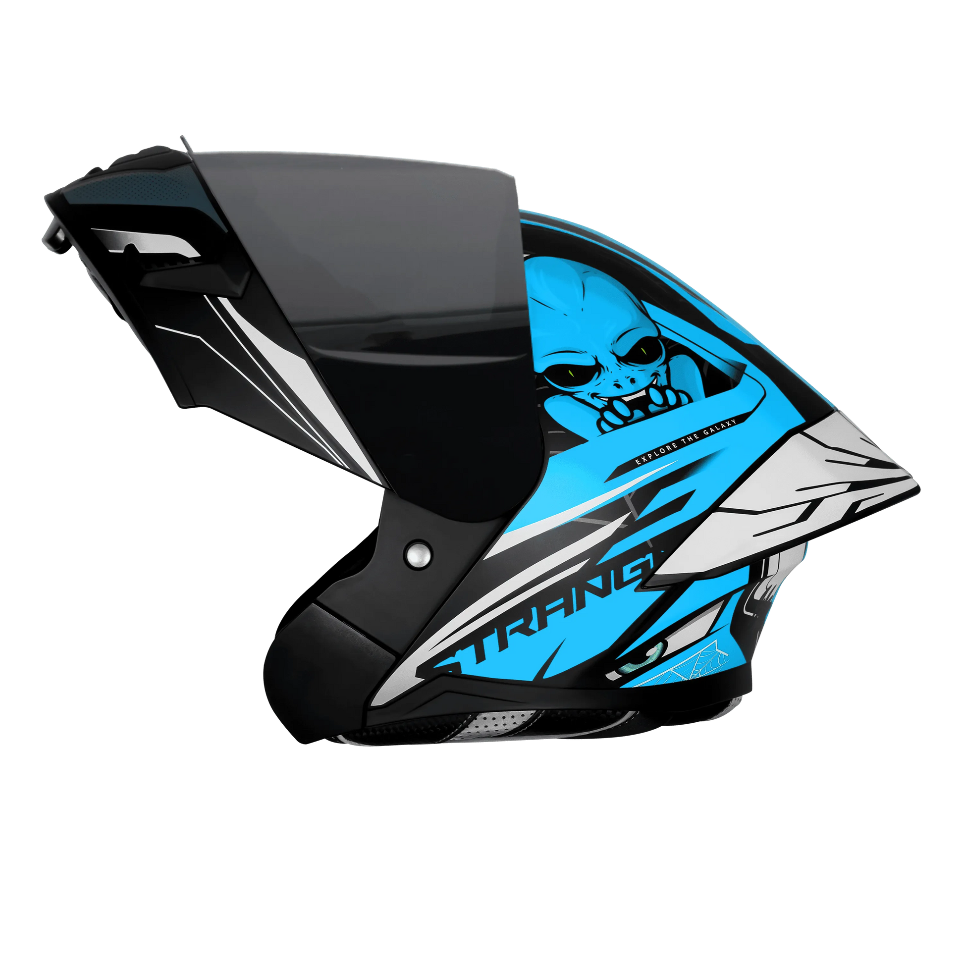 The SBA-20/SB-106 Strange combines bold Jazz Blue graphics with a sleek glossy black finish. Perfect for urban riders who want a helmet that’s as stylish as it is functional, this flip-up helmet delivers protection, ventilation, and comfort in one aggressive design.