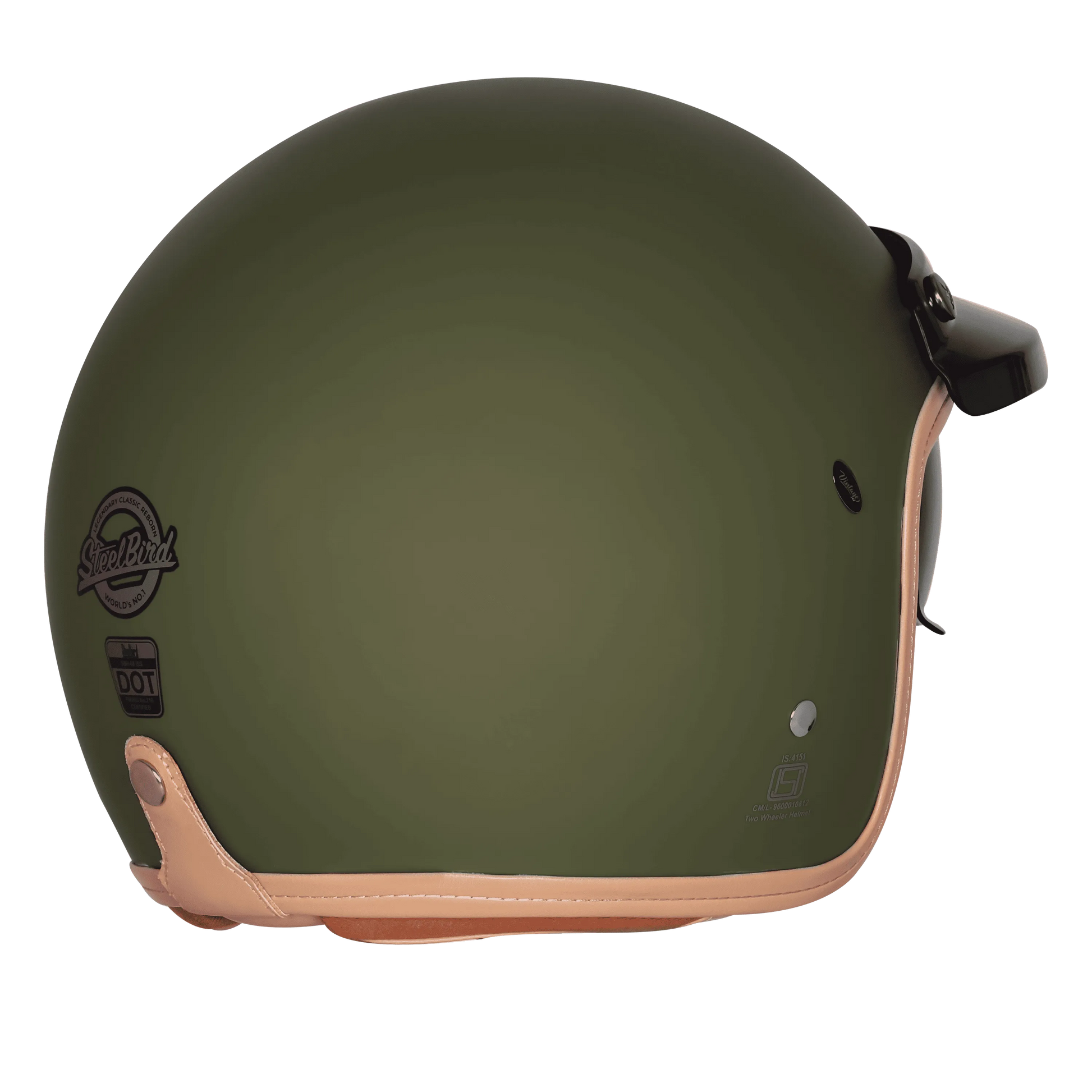 - Half Face Helmet with a bold Vintage Matt Battle Green finish — rugged, stylish, and perfect for riders who love a military-inspired look