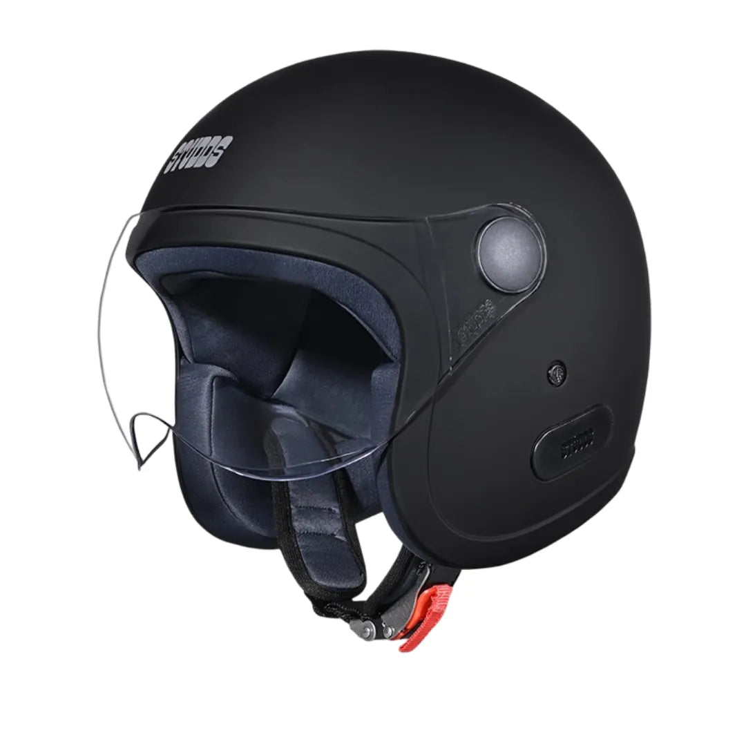 THE STUDDS JET UNICOLOR IS A STYLISH OPEN-FACE HELMET WITH A SHORT VISOR, HIGH-IMPACT OUTER SHELL, REGULATED-DENSITY EPS, HYPOALLERGENIC LINER, AND QUICK-RELEASE CHIN STRAP. AVAILABLE IN VARIOUS COLORS AND SIZES FOR A PERFECT FIT.