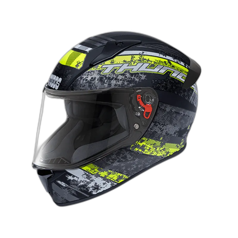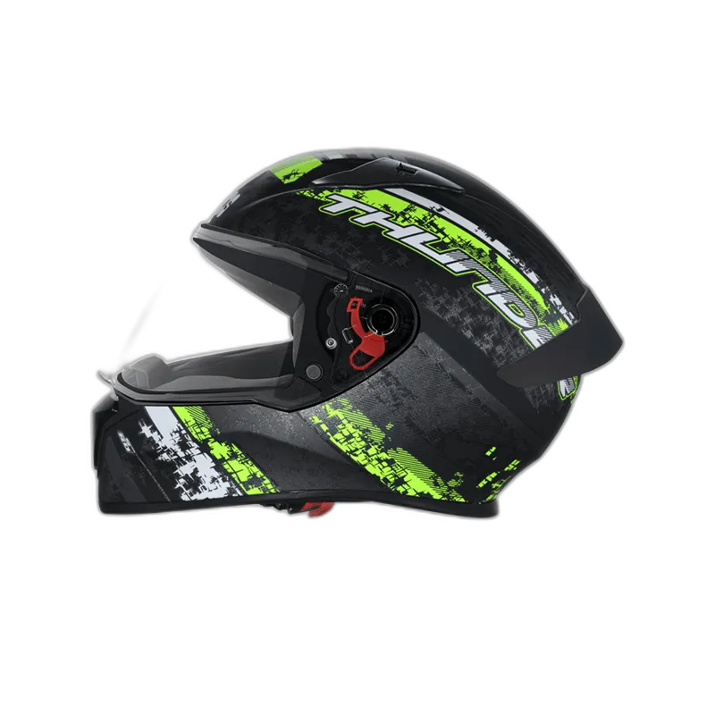 Thunder is one of the most stylish and aggressive helmets from STUDDS. Its aerodynamic design complimented with spoiler and attractive solid colour gives it a perfect look. Thunder is a full face helmet with aerodynamic design , dynamic ventilation system, quick release visor and chin strap.