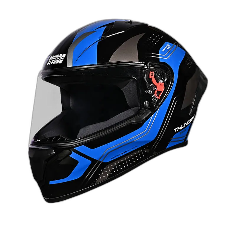 Thunder is one of the most stylish and aggressive helmets from STUDDS. Its aerodynamic design complimented with spoiler and attractive solid colour gives it a perfect look. Thunder is a full face helmet with aerodynamic design , dynamic ventilation system, quick release visor and chin strap.