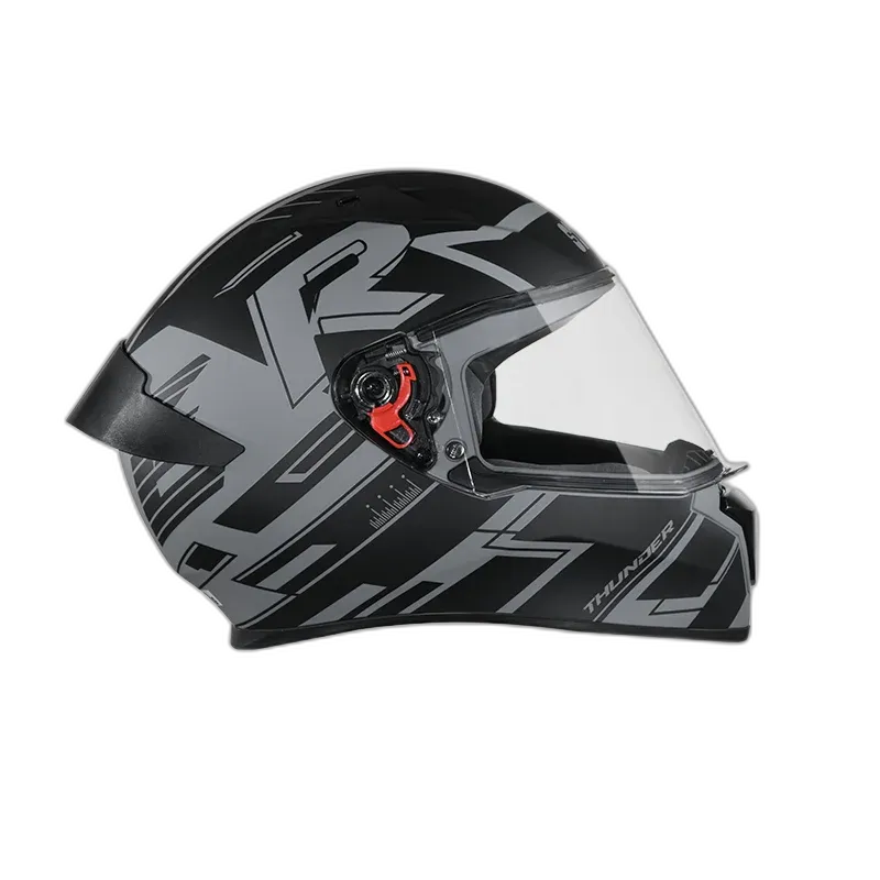 Thunder is one of the most stylish and aggressive helmets from STUDDS. Its aerodynamic design complimented with spoiler and attractive solid colour gives it a perfect look. Thunder is a full face helmet with aerodynamic design , dynamic ventilation system, quick release visor and chin strap.