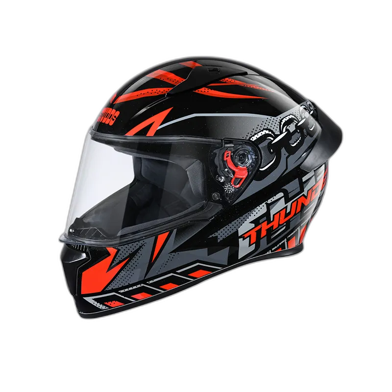 Thunder is one of the most stylish and aggressive helmets from STUDDS. Its aerodynamic design complimented with spoiler and attractive solid colour gives it a perfect look. Thunder is a full face helmet with aerodynamic design , dynamic ventilation system, quick release visor and chin strap.