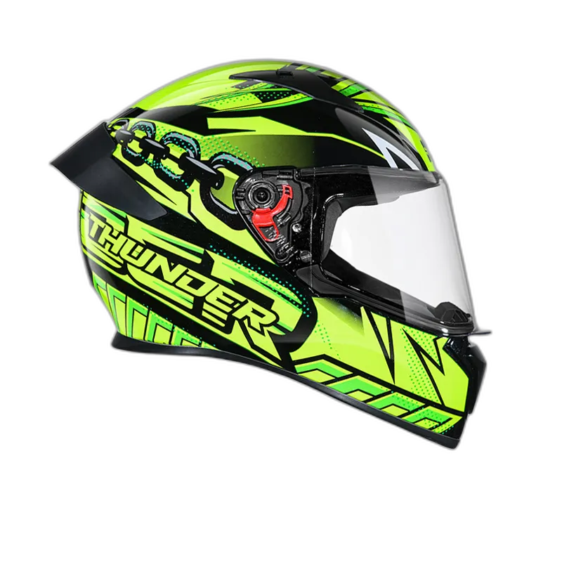 Thunder is one of the most stylish and aggressive helmets from STUDDS. Its aerodynamic design complimented with spoiler and attractive solid colour gives it a perfect look. Thunder is a full face helmet with aerodynamic design , dynamic ventilation system, quick release visor and chin strap.