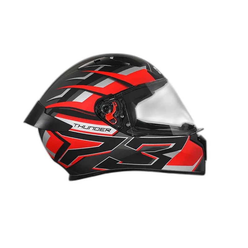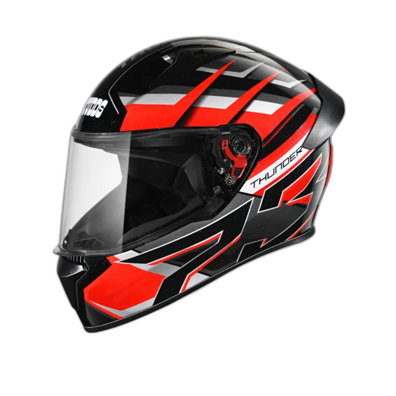 Thunder is one of the most stylish and aggressive helmets from STUDDS. Its aerodynamic design complimented with spoiler and attractive solid colour gives it a perfect look. Thunder is a full face helmet with aerodynamic design , dynamic ventilation system, quick release visor and chin strap.