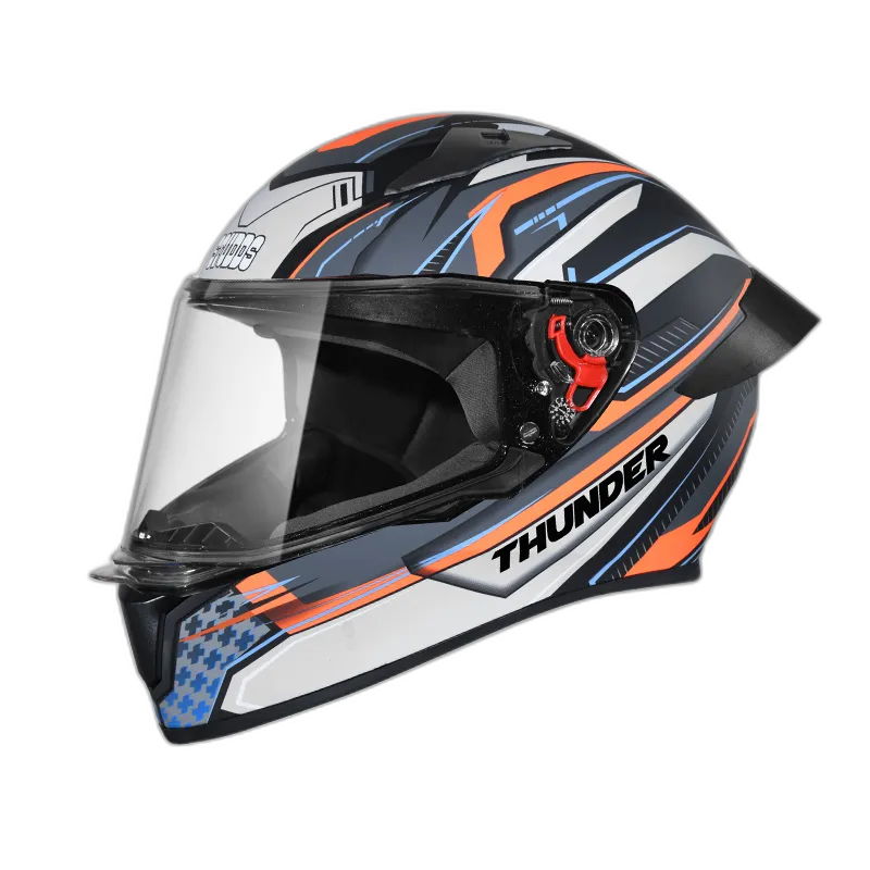 Thunder is one of the most stylish and aggressive helmets from STUDDS. Its aerodynamic design complimented with spoiler and attractive solid colour gives it a perfect look. Thunder is a full face helmet with aerodynamic design , dynamic ventilation system, quick release visor and chin strap.
