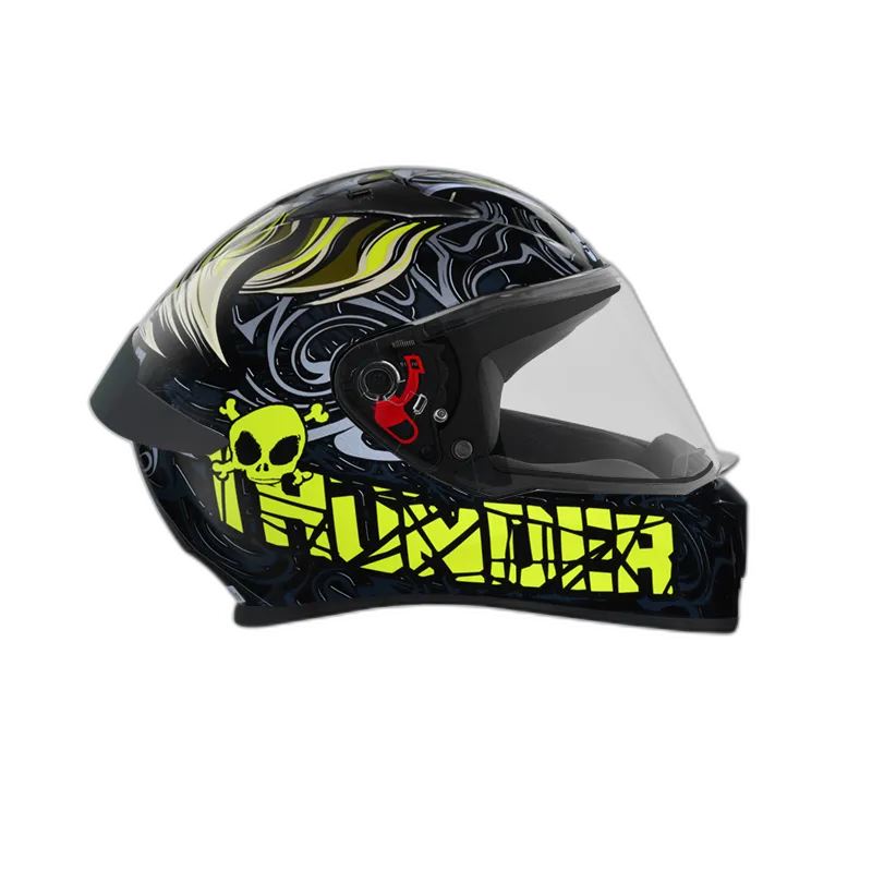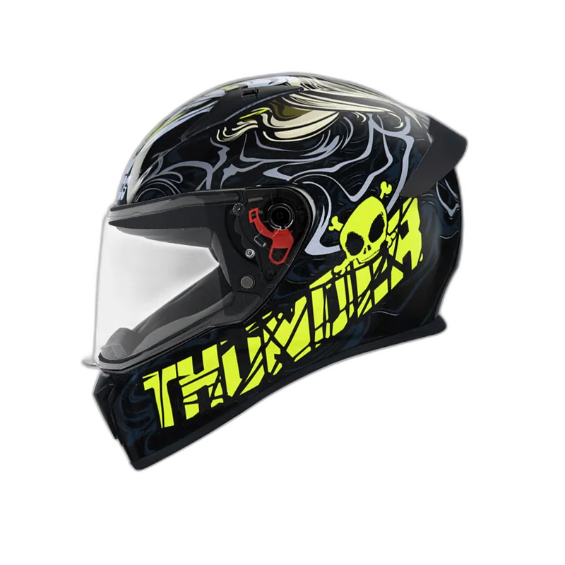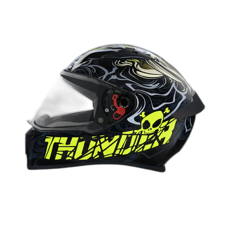 Thunder is one of the most stylish and aggressive helmets from STUDDS. Its aerodynamic design complimented with spoiler and attractive solid colour gives it a perfect look. Thunder is a full face helmet with aerodynamic design , dynamic ventilation system, quick release visor and chin strap.