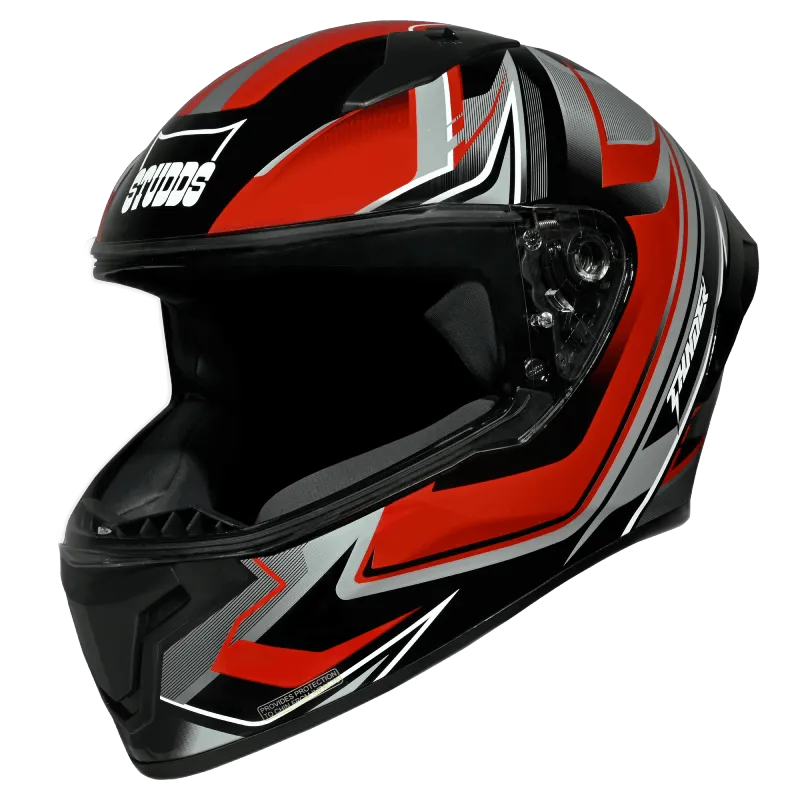 Thunder is one of the most stylish and aggressive helmets from STUDDS. Its aerodynamic design complimented with spoiler and attractive solid colour gives it a perfect look. Thunder is a full face helmet with aerodynamic design , dynamic ventilation system, quick release visor and chin strap.