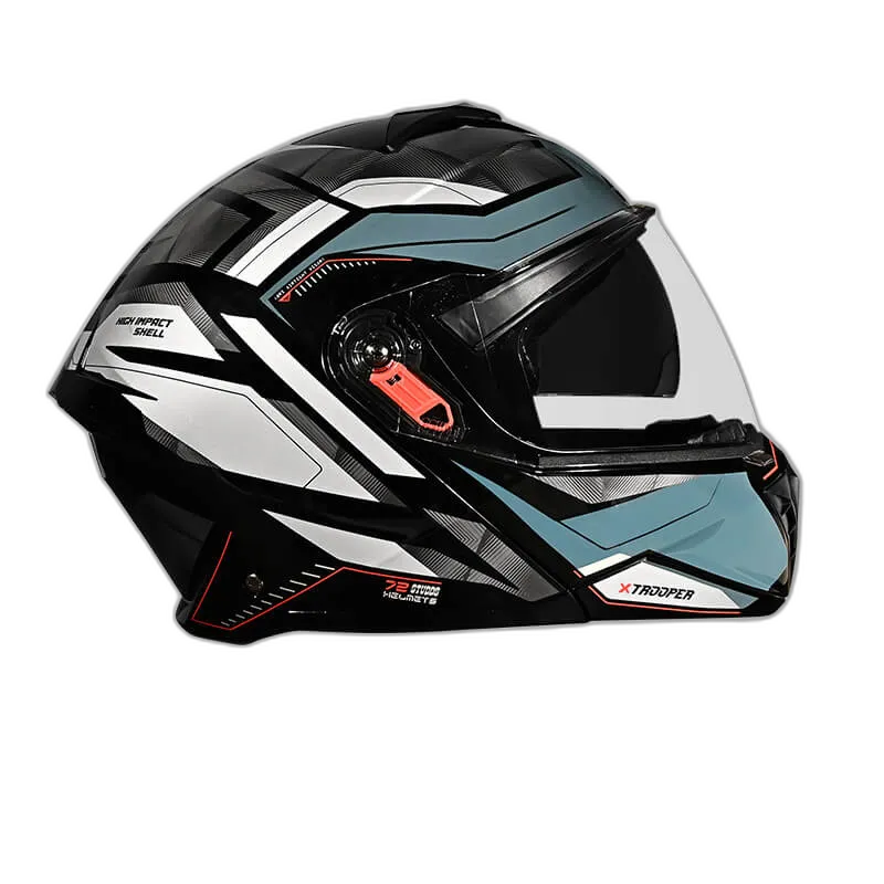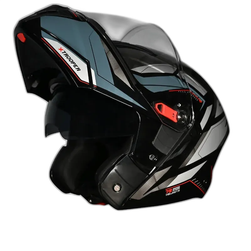 Trooper DV is a flip-up full-face helmet with product features like high impact outer shell and regulated density EPS, hypoallergenic liner, quick release visor and quick release chin strap. Trooper DV comes in various sizes and colour options.