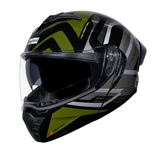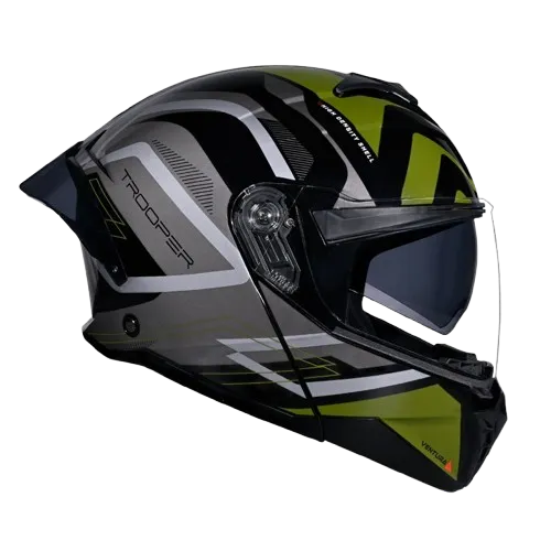 Trooper DV is a flip-up full-face helmet with product features like high impact outer shell and regulated density EPS, hypoallergenic liner, quick release visor and quick release chin strap. Trooper DV comes in various sizes and colour options.