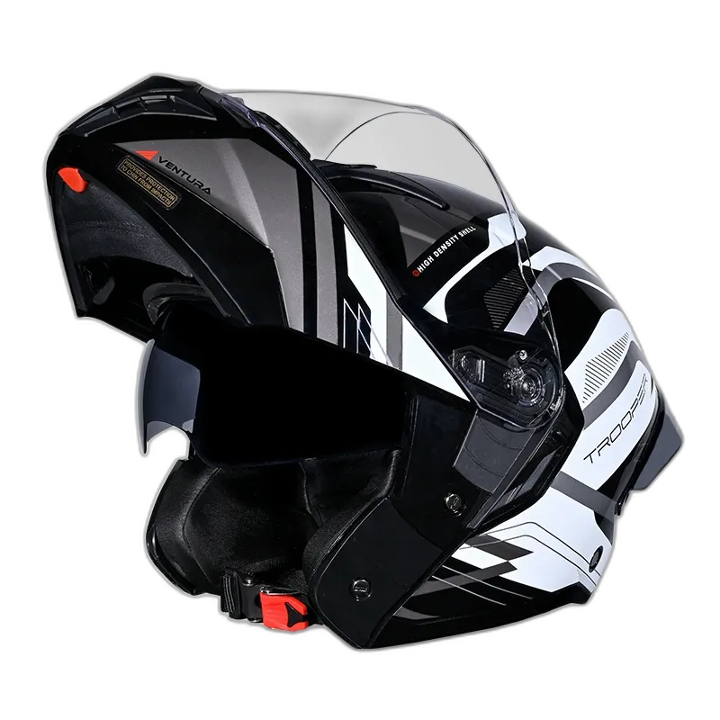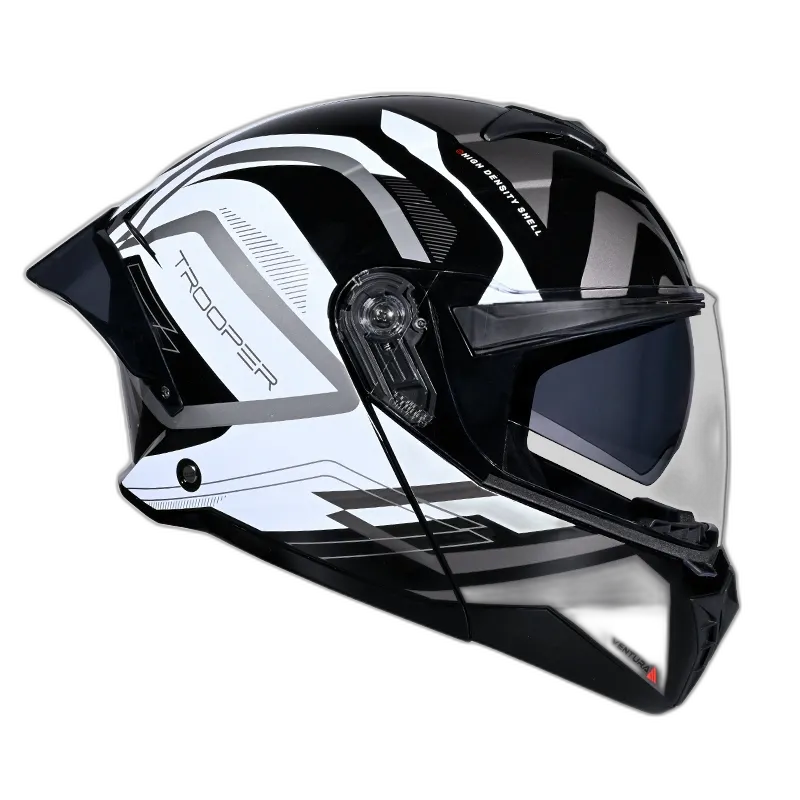 Trooper DV is a flip-up full-face helmet with product features like high impact outer shell and regulated density EPS, hypoallergenic liner, quick release visor and quick release chin strap. Trooper DV comes in various sizes and colour options.